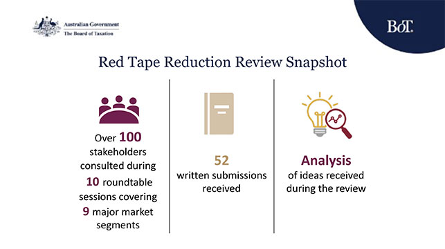 As part of the review, the Board will stocktake any tax‑related compliance and red tape reduction recommendations from the Economic Reform Roundtable public submissions, as well as previous Board reviews and recent stakeholder engagement by the Board which discussed tax compliance burden.